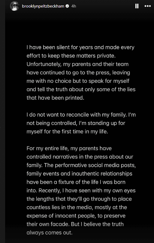 “I have been silent for years and made every effort to keep these matters private,” Brooklyn wrote. “Unfortunately, my parents and their team have continued to go to the press, leaving me with no choice but to speak for myself and tell the truth about only some of the lies that have been printed.”