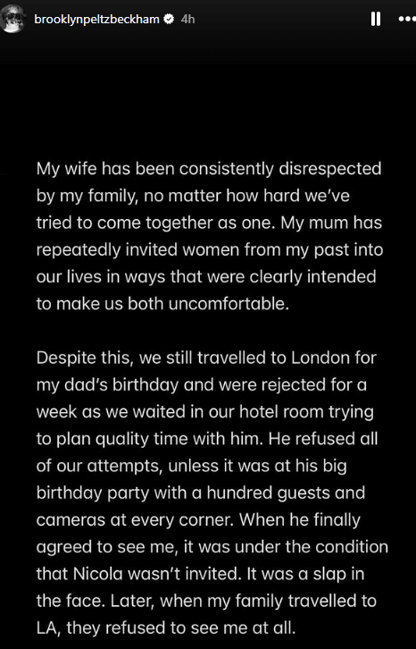 The statement marks the first time Brooklyn has directly addressed the long-rumoured family feud that has followed him since his 2022 wedding. While the Beckhams have never publicly acknowledged a rift, online speculation intensified after Brooklyn and Nicola appeared increasingly absent from family events and social media posts.