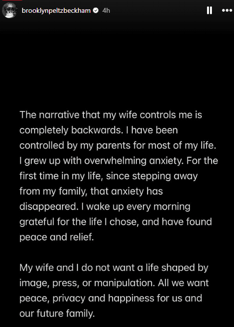 The statements conclude with a clear declaration of intent: Brooklyn and Nicola say they want a future free from media manipulation, public performance, and family pressure — choosing privacy, peace, and happiness over reconciliation.