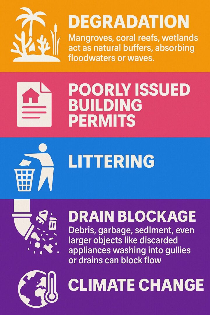 - Mangroves, coral reefs, wetlands act as natural buffers, absorbing floodwaters or waves. When these are degraded (due to pollution, construction, overuse), the buffering capacity drops.