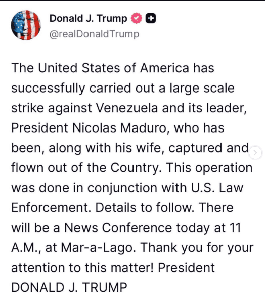 Late Friday night into the early hours of Saturday, explosions and airstrikes were reported in Caracas, Venezuela’s capital. President Trump announced that a “large-scale strike” by U.S. forces resulted in Maduro’s capture and removal from the country. The operation, described as Operation Absolute Resolve in preliminary reports, targeted multiple strategic locations to neutralize Venezuela’s defense before Maduro and his wife were seized.