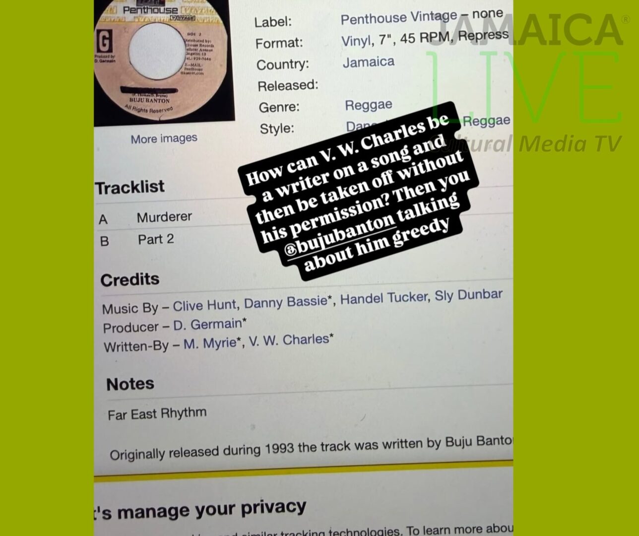 Screenshots circulating online show documentation from a vinyl release listing songwriting credits as M. Myrie (Buju Banton) and V.W. Charles (Wayne Wonder) — raising questions about whether Wayne’s name was later removed from certain publishing records.